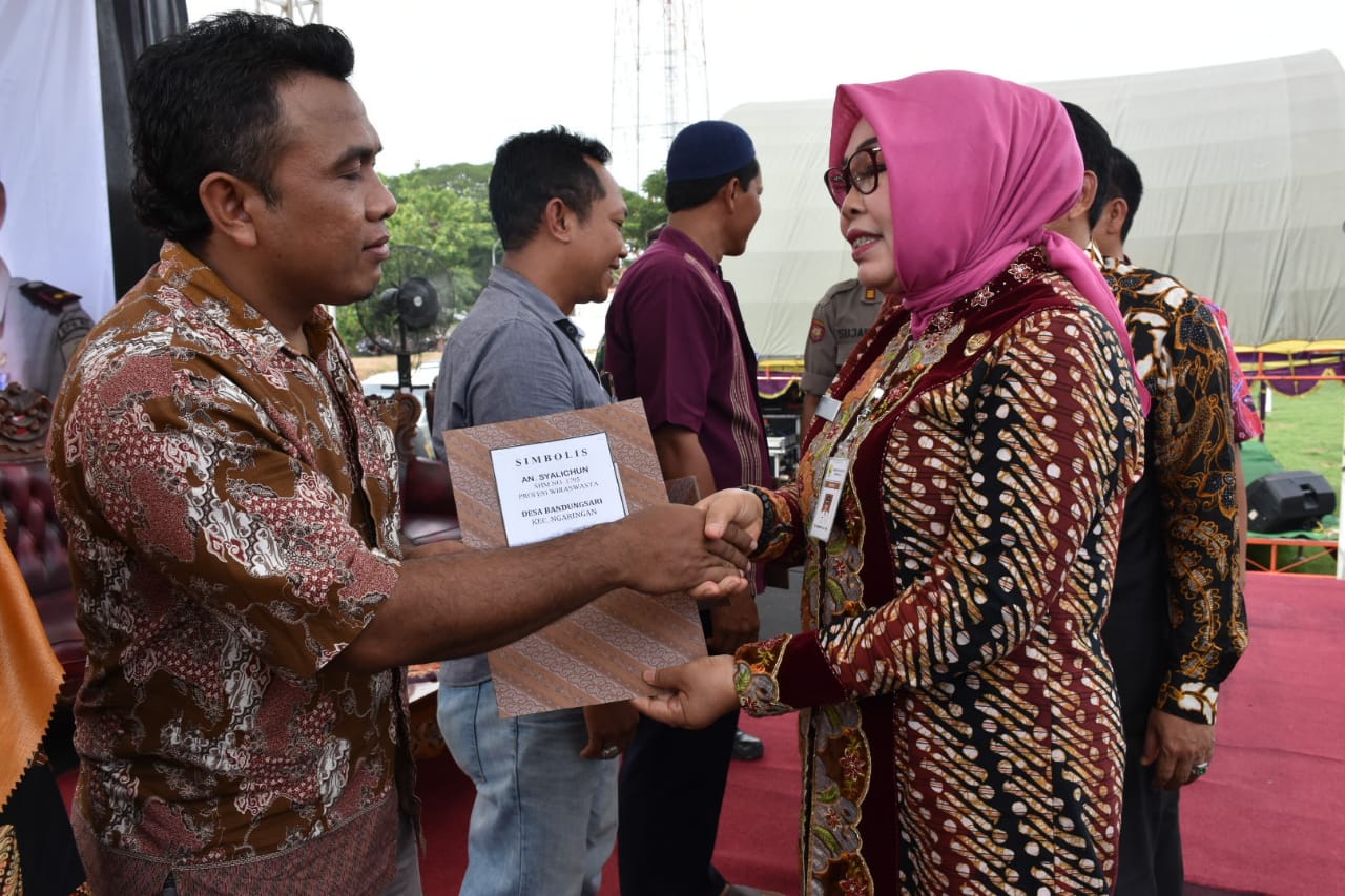 Ngaringan (12/12) - Bupati Grobogan Hj. Sri Sumarni, SH. MM. menyerahkan sertifikat kepada warga masyarakat di wilayah Kecamatan Ngaringan, Kamis 12 Desember 2019 di Lapangan Desa Ngaringan Kecamatan Ngaringan. Pada kesempatan tersebut Bupati didampingi oleh Kepala BPN Kabupaten Grobogan, Kabag. Pemdes Setda Kabupaten Grobogan, Kabag. Humas Setda Kabupaten Grobogan, Forkompincam Kecamatan Ngaringan, Direktur BPR-BKK Kecamatan Ngaringan, Kepala KUA Kecamatan Ngaringan, Kepala Desa Se-Kecamatan Ngaringan. Adapun sertifikat yang diserahkan sejumlah 2.760 buah terdiri dari 197 buah untuk warga Desa Ngaringan, 243 warga Desa Ngarap-arap, 1.534 warga Desa Tanjungharjo, dan 786 warga Desa Bandungsari. Camat Ngaringan Widodo Joko Nugroho, S.STP. menyampaikan ucapan terima kasih dan penghargaan yang setinggi-tingginya kiranya Ibu Bupati Grobogan Hj. Sri Sumarni, SH. MM. berkenan hadir dan langsung menyerahkan sertifikat kepada warga masyarakat di wilayah Kecamatan Ngaringan. Lebih lanjut Camat Ngaringan menegaskan bahwanya dengan kecintaannya kepada seluruh warga masyarakat Kabupaten Grobogan, khususnya yang berada di wilayah Kecamatan Ngaringan ini, Ibu Bupati berkenan hadir. Camat Widodo juga menegaskan bahwa sertifikat merupakan pengakuan secara hukum terhadap kepemilikan tanah, oleh sebab itu camat meminta agar sertifikat disimpan dan dapat digunakan sebaik-baiknya. Sementara itu, Bupati Grobogan Hj. Sri Sumarni, SH. MM. menjelaskan bahwa program penyertifikatan ini merupakan program nasional yang merupakan program prioritas dari Presiden RI Bapak Joko Widodo, Bupati juga berpesan agar warga yang sudah menerima sertifikat tersebut untuk menggunakan sertifikatnya dengan sebaik-baiknya sesuai dengan peruntukannya.