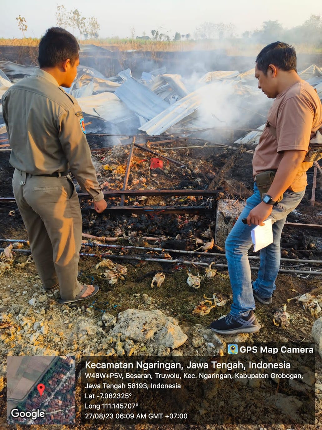 Pada hari minggu tgl 27 Agustus 2023 pukul 00.30 wib telah terjadi kebakaran kandang ayam milik sdr. DHANY ENGGAL PRASETYO yang terletak ditengah sawah ikut Dusun Krajan Barat rt. 03 rw. 02  Desa Tanjungharjo Kecamatan Ngaringan Kab Grobogan, bahwa sebelum kejadian saksi satu dan dua sekitar pukul 23.30 melaksanakan aktivitas pengecekan ayam dan pengecekan lokasi sekitar kandang ayam. Sekira 30 menit saksi satu dan saksi dua kembali lagi ke tempat saksi di tempat istirahat yg berada di samping kandang ayam tersebut. Pada saat akan beristirahat tiba tiba lampu padam kemudian empat saksi keluar dari ruang istirahat dan mengecek kandang kembali, pada saat mengecek saksi melihat ada api yg sudah membakar bagian kandang ayam sebelah barat kemudian keempat saksi berusaha memadamkan api dengan alat seadanya. Dikarenakan posisi kandang berada ditengah sawah dan jauh dari pemukiman warga, Api semakin membesar karena angin ditengah sawah sedikit kencang menyebabkan kebakaran tersebut semakin besar . Karena kewalahan kemudian saksi 2 menghubungi kepala Desa Tanjungharjo dan kemudian Kepala Desa  menghubungi Damkar Wirosari dan Polsek Ngaringan. Sekira pukul 01.30 wib petugas Damkar, Petugas Polsek Ngaringan datang ke lokasi api masih besar dan membakar hampir  keseluruhan kandang ayam tersebut selanjutnya Petugas Damkar, petugas Polsek Ngaringan dan  dibantu warga untuk memadamkan api, kurang lebih satu jam setengah api berhasil dipadamkan. Penyebab kebakaran diduga dari konseleting hubungan arus pendek listrik pada mesin blower.